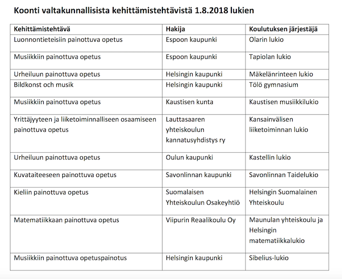 – Erityisen koulutustehtävän lukiot monipuolistavat koulutustarjontaa, kehittävät lukiokoulutusta ja antavat nuorille mahdollisuuksia oppia enemmän ja syvemmin. Uuden valtakunnallisen tehtävän myötä tietyille lukioille tulee erityinen vastuu myös jakaa osaamistaan siten, että se palvelee koko lukiokenttää, opetusministeri Sanni Grahn-Laasonen perustelee.