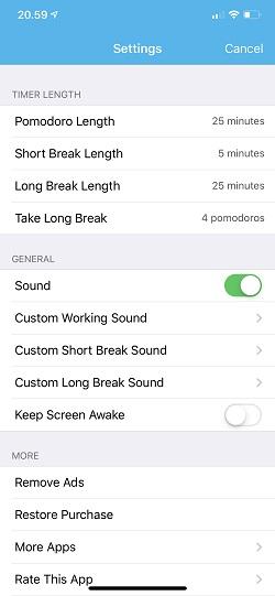25 Minutes on yksi yksinkertaisimmista Pomodoro-tekniikkaa tukevista sovelluksista. Sovellus toimii vain juuri siinä, mihin se on tarkoitettu eli näyttämään aikalaskurit työlle ja tauoille. Ohjelmaan ei määritetä, mitä ollaan tekemässä.