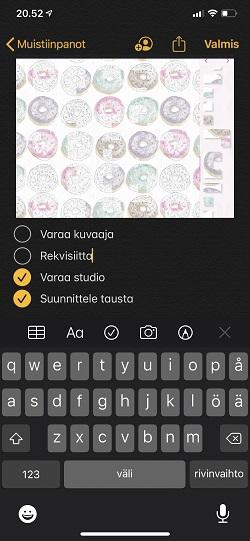 Muistiinpanot ovat oiva tapa tallentaa kaikki uudet ajatukset pitkin työviikkoa. Niillä saa näppärästi talteen myös asiakastapaamisten pääpointit, joiden perusteella tehtävissä voi edetä. Pienemmissä projekteissa ja työkeikoissa ei ole aina tarpeen kirjata kaikkea dokumenttiin tai taulukkoon, joiden lukeminen puhelimelta on ikävän haastavaa.