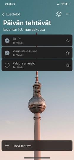 Hyvä vaihtoehto to-do-listojen hallintaan on Microsoftin To Do. Sovellus on helppokäyttöinen ja monipuolinen. Tehtävien lisäys käy käden käänteessä. Niitä voi lisätä omiin luetteloihin, joita voi edelleen sijoittaa eri ryhmiin. Näiden ansiosta eri asiakkaille suoritettavat työt eivät sekoitu keskenään.