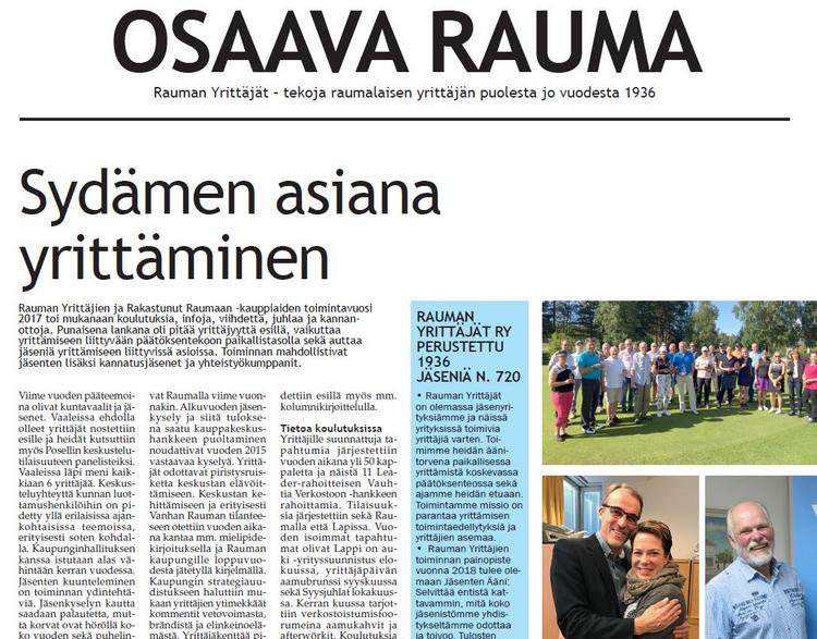 Rauman Yrittäjät ry:n oma julkaisu Osaava Rauma on ilmestynyt. Lehti ilmestyy tänä vuonna neljä kertaa sanomalehti Länsi-Suomen välissä. Pääset lukemaan sen myös sähköisesti nettisivuiltamme. Lehden tavoitteena on kertoa yrittäjyydestä ja yrittäjäjärjestön toiminnasta.