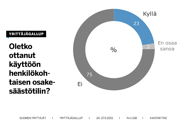 Suomen Yrittäjien teettämän Yrittäjägallupin perusteella osakesäästötili on käytössä 20 prosentilla yksinyrittäjistä, 22 prosentilla alle viisi henkilöä työllistävistä ja 27 prosentilla yli viisi henkilö työllistävillä yrittäjillä.