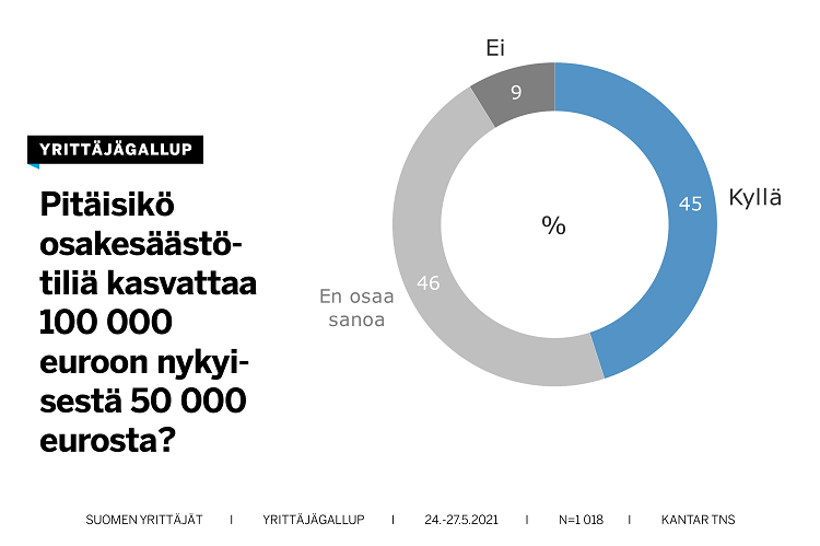 Osakesäästötilille voi sijoittaa nykyisellään enintään 50 000 euroa. Yrittäjägallupin mukaan 45 prosenttia yrittäjistä kannattaa rajan nostamista 100 000 euroon. Vain yhdeksän prosenttia vastustaa ajatusta.