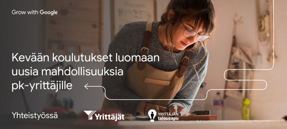 Grow with Google, Suomen Yrittäjät ja Yrittäjän talousapu käynnistävät pk-yrityksille tänä keväänä uuden koulutusohjelman, jonka tarkoituksena on tukea yrittäjiä ja antaa käytännön työkaluja tekemään 360 asteen kartoituksen yrityksen taloudesta, myynnistä, markkinoinnista ja yrittäjän voimavaroista. Ohjelma koostuu neljästä verkkokoulutuksesta, joissa pääset oppimaan alan asiantuntijoilta parhaita vinkkejä liiketoiminnan kasvun tehostamiseksi, budjetin suunnittelemiseksi ja liikevaihdon kasvattamiseksi.