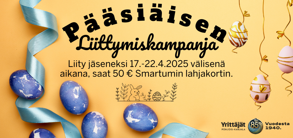 Pääsiäinen on uuden alun aikaa, ja me haluamme tehdä siitä entistä paremman myös sinun yrityksellesi! Nyt on täydellinen hetki liittyä Pohjois-Karjalan Yrittäjien jäseneksi ja saada kaikki hyödyt käyttöösi – nauti verkostoitumismahdollisuuksista, tapahtumista ja neuvontapalveluista.