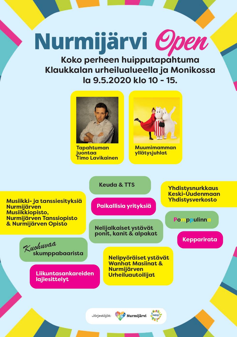 Toistamiseen järjestettävä koko perheen tapahtuma Nurmijärven Open – tarjoaa nimensä mukaisesti kaikille nurmijärveläisille toimijoille näyteikkunan oman toimintansa ja palveluiden esittelyyn.