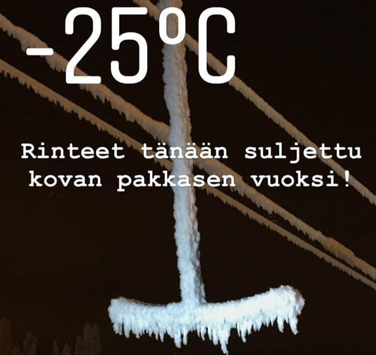 Kova pakkanen kurittaa talviurheilukeskuksia. Hyrynsalmella Kainuussa sijaitsevassa Ukkohallan hiihtokeskuksessa jouduttiin sulkemaan laskettelurinteet torstaina 24. tammikuuta, sillä pakkasmittari huiteli 25 asteessa. Mäkeen ei ollut asiaa.