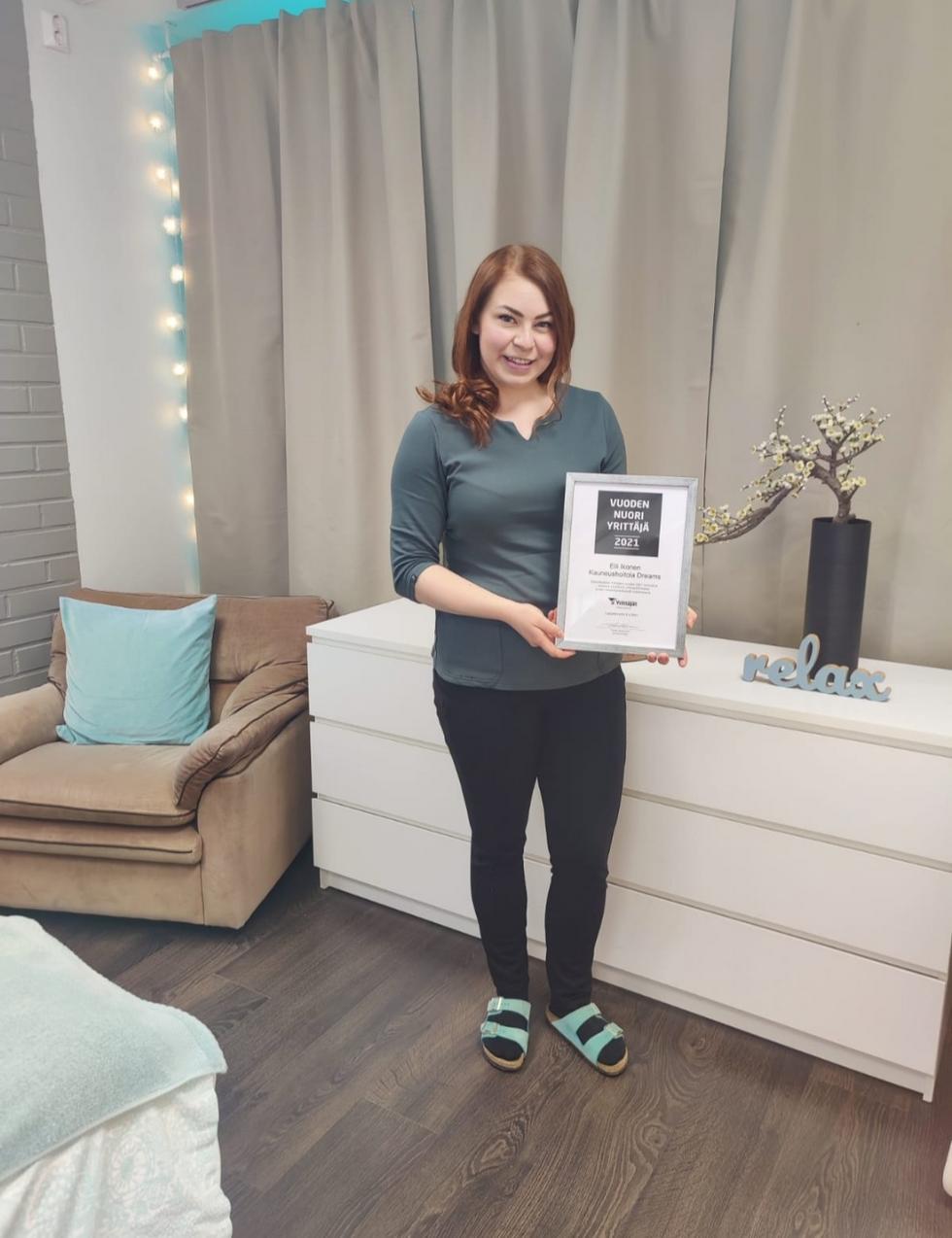 Etelä-Karjalan Vuoden nuori yrittäjä -kilpailun voittajaksi valikoitui imatralainen Elli Ikonen. Kauneushoitola Dreamsin yrittäjä on aloittanut yrityksensä nuorena ja nyt lähes 10 vuoden yrittäjyyden aikana kasvattanut toimintaansa määrätietoisesti. Yksinyrittäjänä aloittaneen Ellin siipien suojissa työskentelee kolme muutakin kauneusalan ammattilaista. Elli on äärimmäisen tunnollinen ja itseltään paljon vaativa yrittäjä, joka ei tunteja laske. Todella esimerkillinen nuori yrittäjä, joka on arvostuksensa ansainnut!
