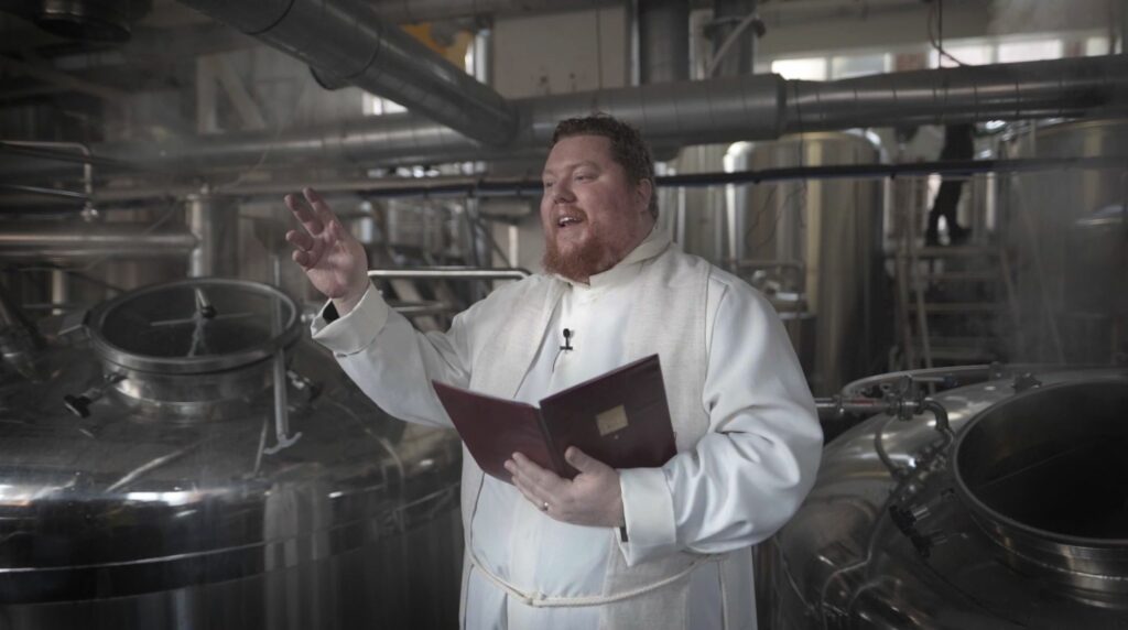 Videon alussa valkoiseen albaan ja stolaan pukeutunut Helsingin Kallion seurakunnan pastori Visa Viljamaa astelee Espoossa sijaitsevan pienpanimon tehdashalliin kirkkomusiikin soidessa taustalla.