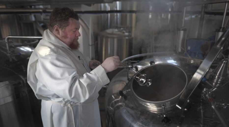 Videon alussa valkoiseen albaan ja stolaan pukeutunut Helsingin Kallion seurakunnan pastori Visa Viljamaa astelee Espoossa sijaitsevan pienpanimon tehdashalliin kirkkomusiikin soidessa taustalla.