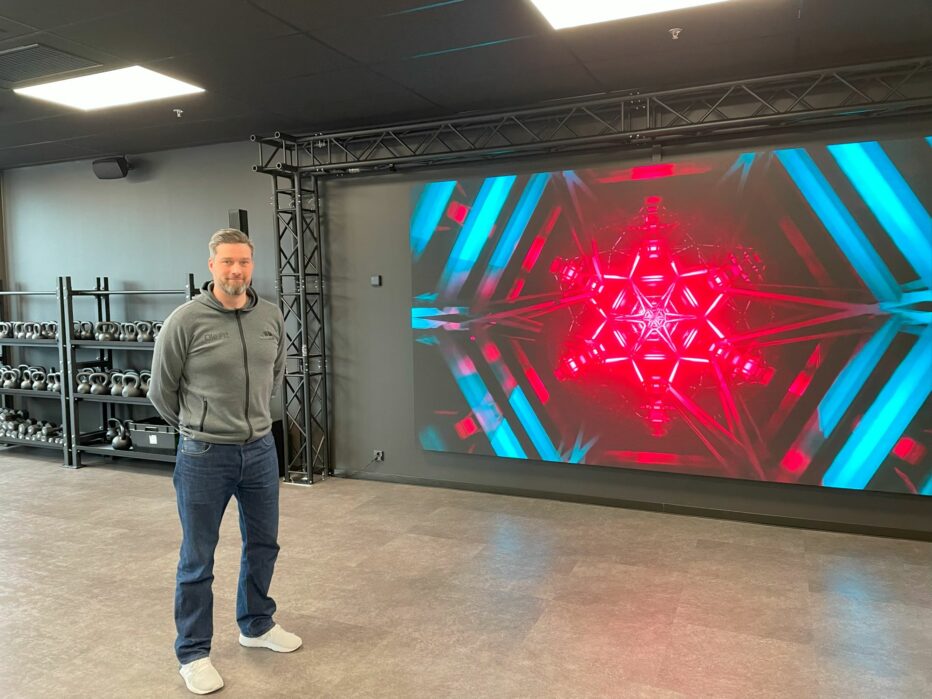 Seisomme keskellä Fitness Space -nimistä salia. Se on yksi Ole.Fit Munkka LUXin lisämaksullisista tiloista, jonka seinällä komeilee kahdeksan neliön suuruinen led-screeni. Tarkka ja teräväpiirteinen 4K-näyttö heijastaa tällä hetkellä välkkyviä abstrakteja kuvioita.