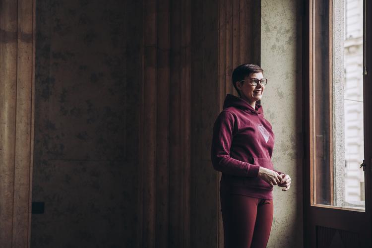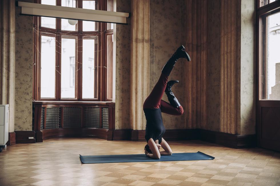 Viestintäalan yrittäjä Aino Pajukangas nojaa käsivarret lattiaan ja nostaa ilmaan ensin yhden ja sitten toisen jalan. Kuvaaja saa rauhassa kuvata, sillä joogaohjaajakoulutuksenkin käyneen Pajukankaan päälläseisonta ei horju.