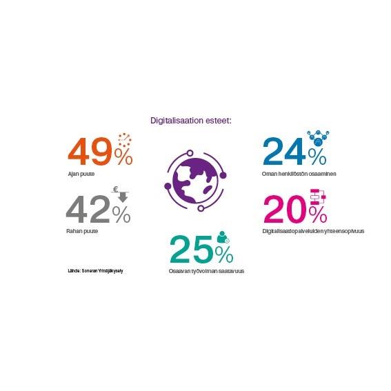 Ajanpuute on yleisin syy siihen, miksi yrittäjä ei ole reagoinut digitalisaation mahdollisuuksiin, Soneran Taloustutkimuksella teettämä yrityskysely kertoo. Vastaajista noin puolet nimesi ajanpuutteen digitalisaatiota eniten jarruttavaksi syyksi. Toinen yleinen digitalisaation este oli rahan puute.