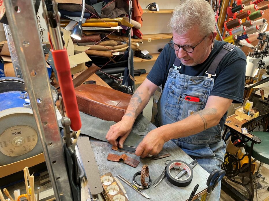 Asiakkaina käy myös paljon muusikoita, joiden kitaranhihnoja Väyrynen korjaa ja värjää.