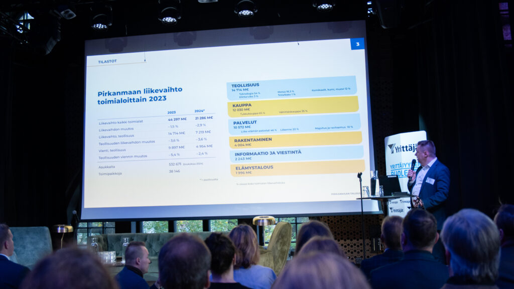 Pirkanmaan Talous 2024 julkaistiin 8.10.2024 jäsenillemme avoimessa tilaisuudessa G Live Labissa Tampereella. Paikalla oli iso joukko yrittäjiä, kuntien ja kaupunkien edustajia, mediaa sekä muita aiheesta kiinnostuneita kansalaisia.