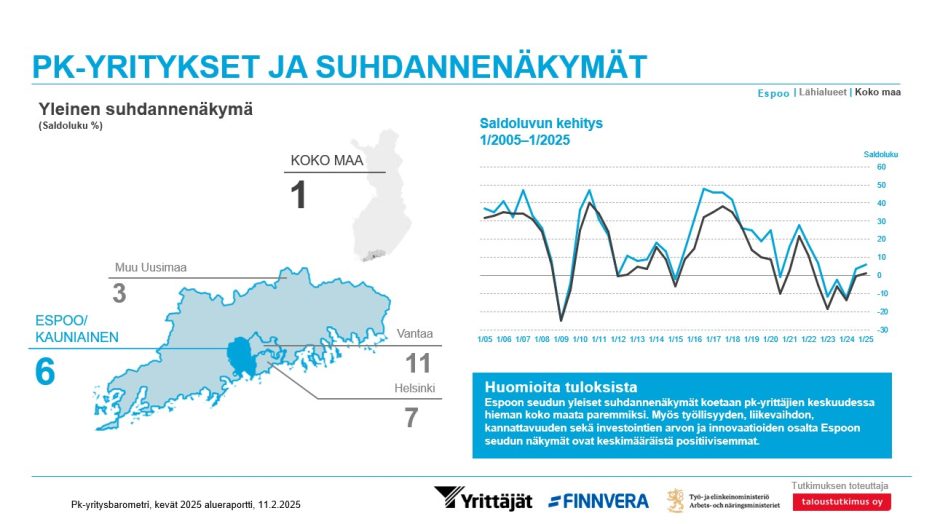 Espoon seudun yleiset suhdannenäkymät koetaan pk-yrittäjien keskuudessa hieman koko maata paremmiksi. Myös työllisyyden, liikevaihdon, kannattavuuden sekä investointien arvon ja innovaatioiden osalta Espoon seudun näkymät ovat keskimääräistä positiivisemmat.