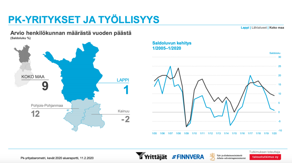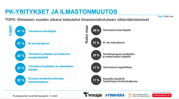 Yrittäjät julkaisevat kaksi kertaa vuodessa pk-yritysbarometrin. Kevään 2020 tuloksista ilmeni, että yleiset suhdannenäkymät ovat pysyneet ennallaan syksyn tilanteeseen nähden ja jonkin verran korkeammalla kuin koko maassa. Lapissa yritysten toimenpiteet kestävän kehityksen edistämiseksi ja ilmastonmuutoksen torjumiseksi ovat korkeammalla tasolla kaikilla osa-alueilla kuin koko maassa.