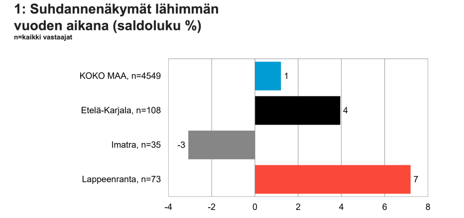 Etelä-Karjalan pk-yritysten suhdannenäkymä on positiivisempi kuin koko maassa keskimäärin. Etelä-Karjalan suhdanneodotusten saldoluku saa arvon 4, kun koko maan lukema on 1. Myös innovaatioiden ja vakavaraisuuden kehityksen näkymät ovat positiivisempia kuin koko maassa keskimäärin, kun taas kannattavuus- ja henkilöstöodotukset ovat koko Suomen tasolla.