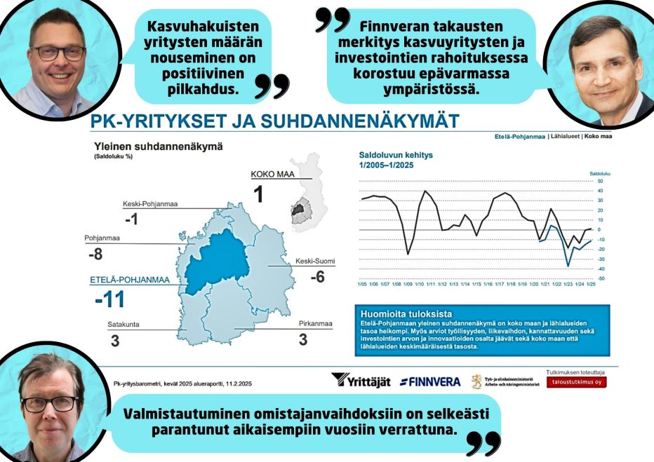 Etelä-Pohjanmaalla yleistä suhdannenäkymää kuvaava saldoluku on -11, kun koko maassa se oli 1. Syksyllä saldoluku oli Etelä-Pohjanmaalla -14 ja koko maassa 0.