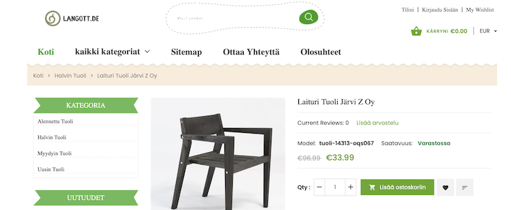 Langott.de -sivulla on ”myynnissä” muun muassa Järvi Z:n Laiturituoli runsaan 30 euron hinnalla. Valmistajan verkkokaupan oikea hinta on 269 euroa.