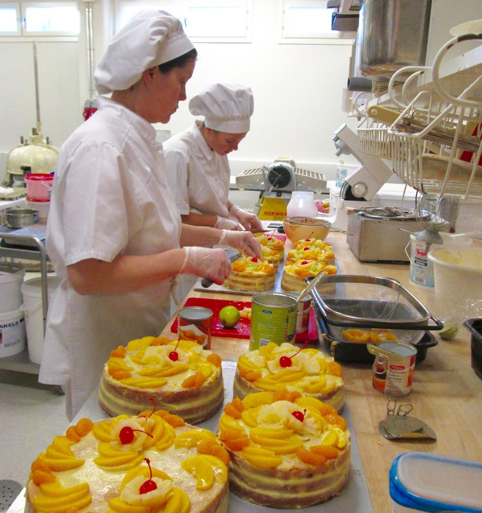 Jo yli 70 vuoden ajan herkkusuita hemmotellut, torniolainen leipomo-kahvila-konditoria Karkiainen on myytävänä Pohjois-Suomen Yrityspörssissä. ”Itsellä alkaa tulla ikä vastaan, eikä ideat ja energia enää riitä. Toivomme, että uusi yrittäjä löytyisi mahdollisimman pian”, yrittäjä Asta Heikkilä toteaa. Kakun teossa Aino Oinas ja Annu Kivilompolo.