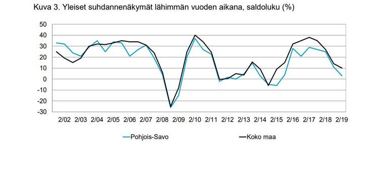Pk-yritysten suhdanneodotukset ovat koko maassa ja etenkin Pohjois-Savossa kevään 2019 tilannetta heikommat. Pohjois-Savon osalta saldoluku oli nyt +3, kun se keväällä oli vielä +11. Suhdannenäkymät heijastuvat nopeasti teollisuuden ja rakentamisen aloihin, joita alueellamme on selvästi muuta maata enemmän.