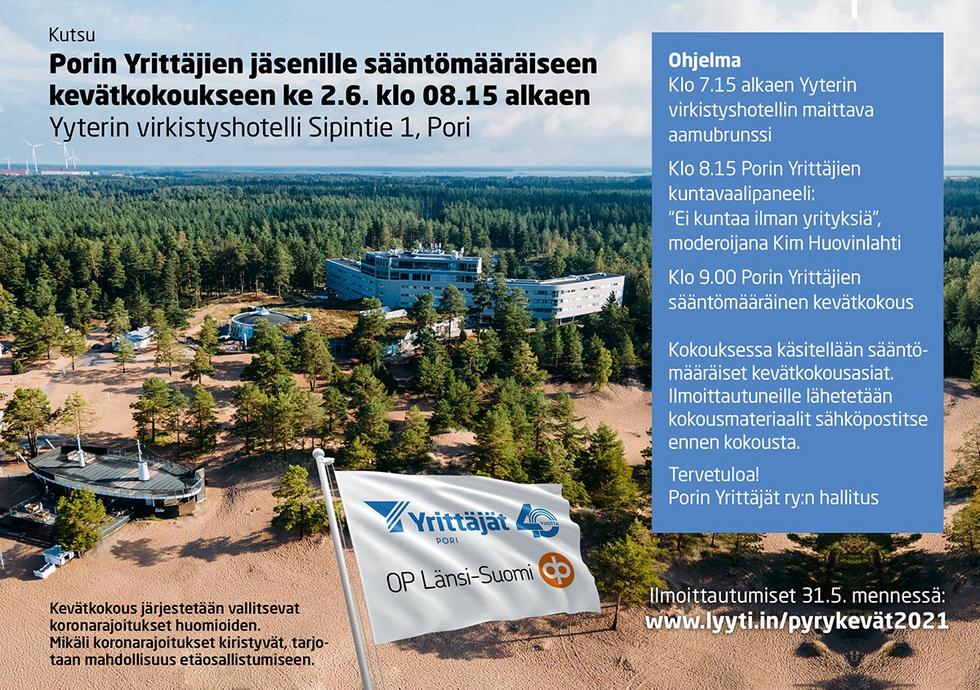 Porin Yrittäjien sääntömääräinen kevätkokous ke 2.6. klo 8.15 Yyterissä. Tule seuraamaan myös mielenkiintoista kuntavaalipaneeliamme!