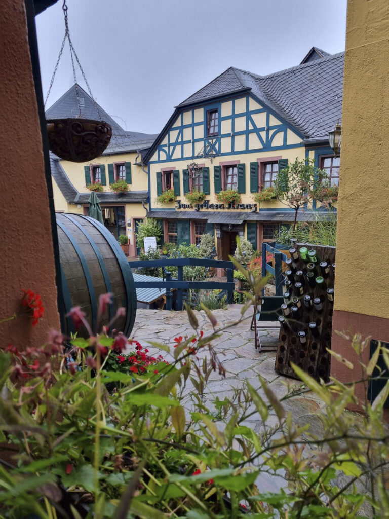 Weinhotel zum Grünen Kranziin Rüdesheimissa näytti juuri niin idylliseltä kuin kuvitella saattoi, tosin joissain huoneissa oli sisäilmaongelmia. Huoneiden vaihto hoitui tehokkaan oppaamme toimesta nopeasti. Maukkaan illallisen jälkeen useat jaksoivat vielä istua iltaa ja maistaa paikallista Rieslingiä uusien tuttavuuksien kanssa hotellin ravintolassa.