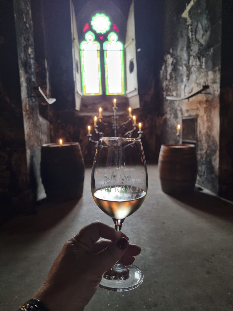 Ja minkälainen olikaan viininmaistelu! Sellaisen maistelun näkee vain fotoshopatuissa kuvissa, mutta me koimme sen oikeasti. Kynttilänvalossa viinikellarin hämärässä hullaannuimme hienostuneista Rieslingeistä! Viinin aromeita maistellessa Gunilla kertoi mielenkiintoisia tarinoita luostarista ja päätimme, että seuraavana vuonna suunnataan viinimatkalle Italiaan.