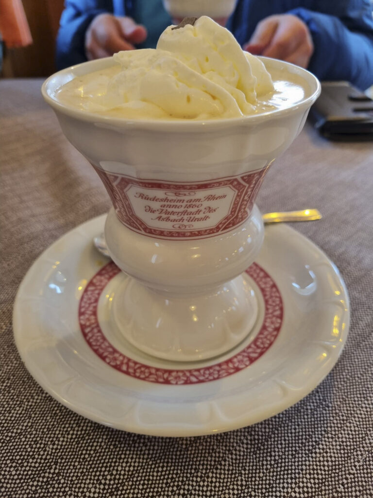 Sunnuntai, kolmas matkapäivä, oli kolea ja pilvinen. Urheasti suuntasimme mahtavalle Reinille laivamatkalle kohti laivoja karille houkutelleen seireeni Lorelein kalliota. Koleuden saattoi torjua esimerkiksi paikallisella Rüdesheim Kaffella, joka tarjoillaan omanlaisista kupeista tarkan prosessin mukaan valmistettuna. Kahvin mausteena käytetään paikallista Asbach Uralt brandya, jota on valmistettu Rüdesheimissa vuodesta 1892.