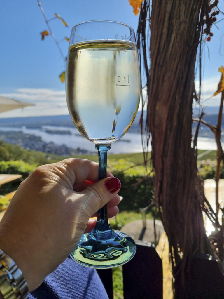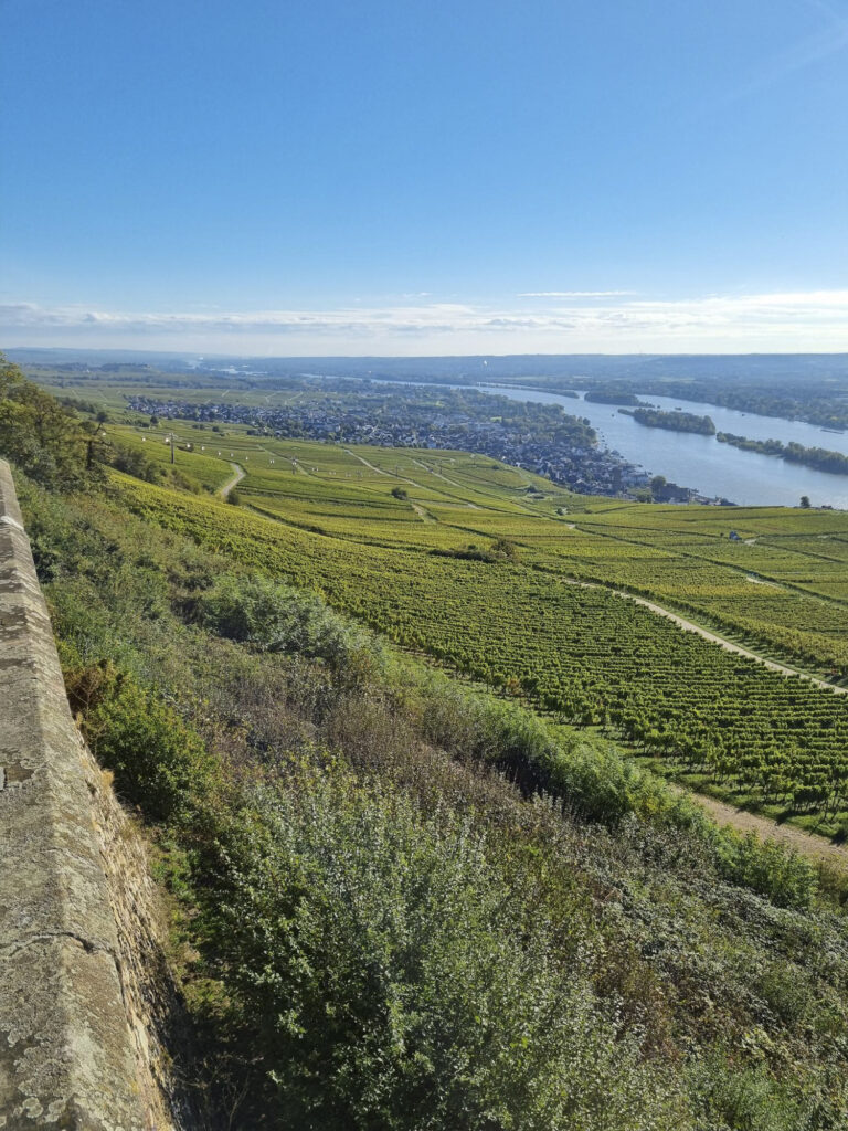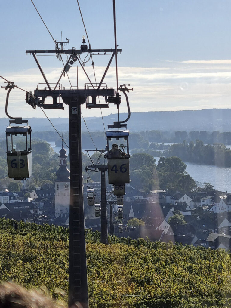 Toisena päivänä suuntasimme ensimmäiseksi Rüdesheimin köysiradalle, joka kulkee viiniköynnösten yllä 1,75 km matkan valtavalle Germania-patsaalle. Matkaa pienessä köysiratavaunussa on 60-luvun alussa taittanut myös itse Elvis Presley elokuvassa G.I. Blues. Näkymät vaunusta ja ylhäältä muistomerkiltä olivat kertakaikkisen upeat aurinkoisen sään täydentäen ihailua. Paluumatkalla löysimme idyllisen viinibaarin, jonka terassilla nautimme virkistävät juomat. Kävelyllä alas kaupunkiin saimme tutustua myös viininkorjuuseen, eikä se ihan helppoa hyvinkin jyrkillä rinteillä ole. Lounaan söimme kaupungin sydämessä Drosselgassella kellopelin alla. Eläväinen viinibaarien katu on vain kolme metriä leveä, 144 pitkä katu.