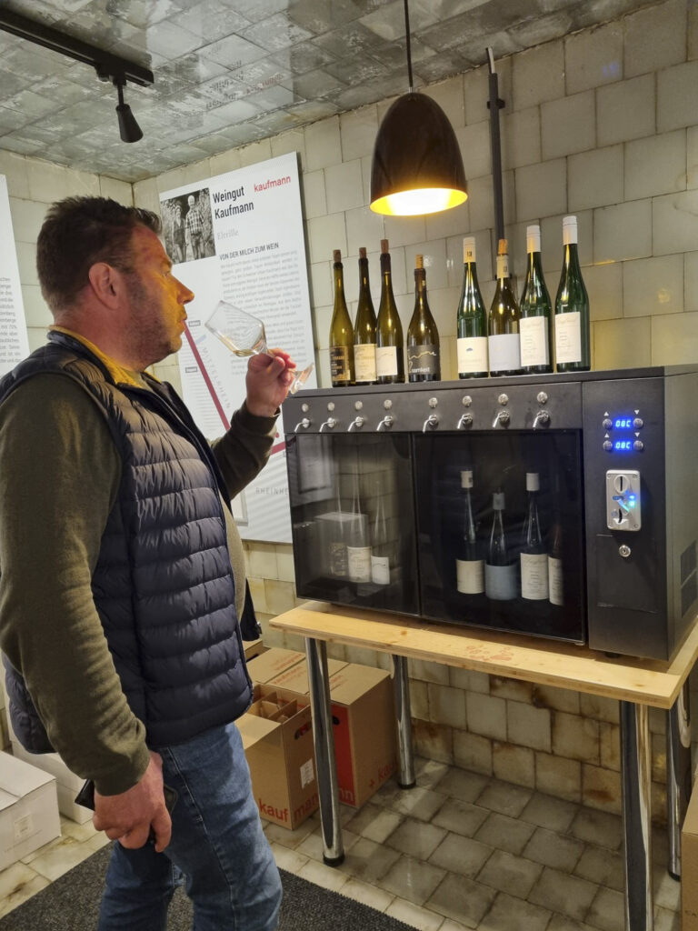 Omatoimi-illaksi Gunilla-oppaamme onnistui järjestämään jännittävää ohjelmaa: viininmaistajaiset kolikkoautomaatilla. RheinWeinWelt-ravintolassa on maisteltavana lähialueiden tuottajien viinejä 76 viinintuottajalta yhteensä puolentoistasataa eri viiniä, joita oman valinnan mukaan voi maistaa. Poletilla sai automaatista 20 cl maistajaiset; monenlaisia makuja tunnistimme viineissä, mutta parinkymmenen makustelun kohdalla alkoivat maut jo muistuttaa toisiaan. Lisäksi ravintolassa oli erittäin hyvä ruoka.