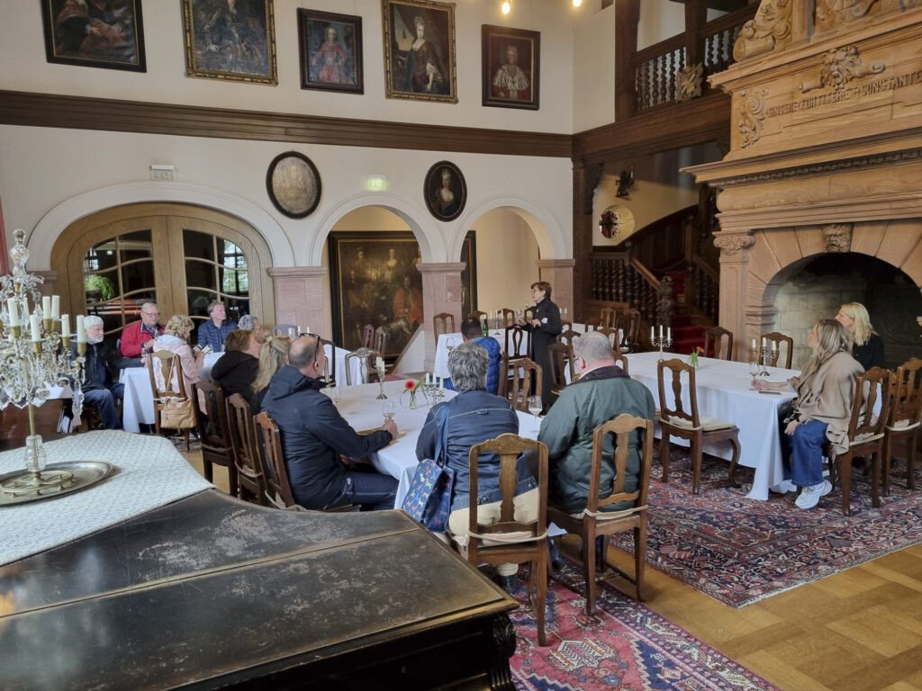 Rein todella virtaa voimakkaasti. Jylhien maisemien ja perinteisen saksalaislounaan jälkeen pääsimme vihdoin varsinaiseen asiaan: viininmaisteluun. Yhdessä Saksan vanhimmista, yli 800 vuotta vanhassa, viinitilalla Schloss Vollradsissa, maistelimme oppaamme Gunillan asiantuntemuksella kolmea eri viiniä tutustuen samalla vaikuttavaan linnaan ja sen vaiheisiin. Ostoksien, joita olivat mm. kauniit (ja maistuvat) Riesling-pullot sekä jännittävät viinilasien kaulapussit, jälkeen nautimme hieman vähemmän jännittävämmän illallisen linnassa.