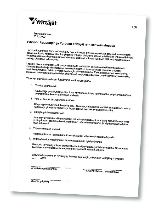 Porvoon kaupunki ja Porvoon Yrittäjät ry ovat solmineet elinvoimalupauksen tälle valtuustokaudelle. Tällä lupauksella kaupunki sitoutuu yhdessä yrittäjäyhdistyksen kanssa edistämään yrittäjäystävällistä ilmapiiriä sekä vahvistamaan elinvoimaisuutta. Yhdessä voimme huolehtia siitä, että kaupunkimme veto- ja pitovoima vahvistuvat.