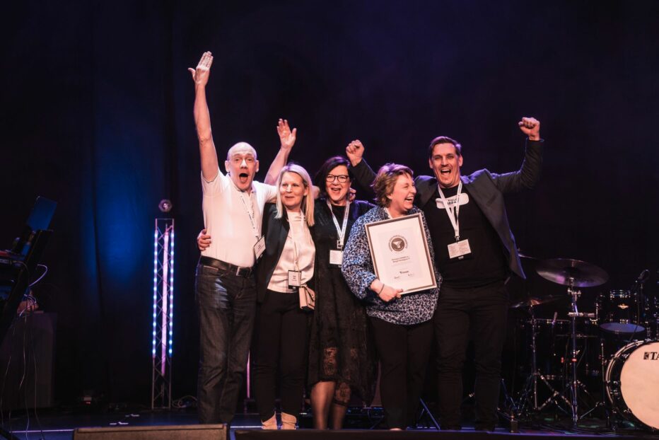Kuvateksti: Porvoon Yrittäjien palkinnon vastaanottivat Porvoon Yrittäjien varapuheenjohtaja ja Uudenmaan Yrittäjien puheenjohtaja Mikko Ahtiainen, hallituksen jäsen Marella Närkki, sihteeri Birgitta Palmqvist, puheenjohtaja Marina Nyberg sekä entinen puheenjohtaja Patrik Björkman.