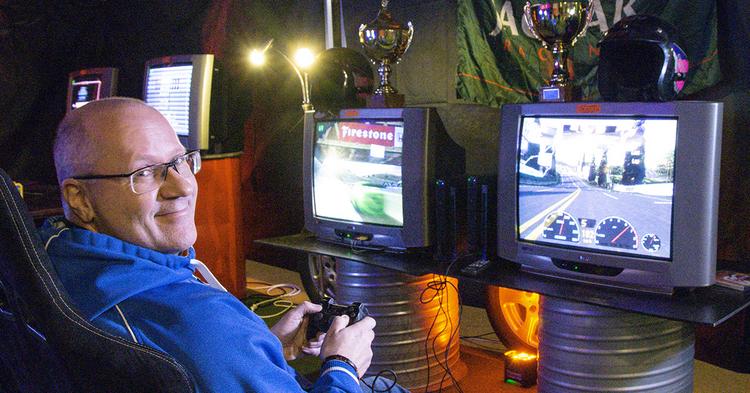 KUVATEKSTI: Kohtaamisia odotellessa. Lasse Pakarinen pystytti Action Factoryyn Retro Games -osaston. Nostalgiaa vanhemmille ja jotain uutta nuoremmille. Yrittäjä itse 1990-luvun rallipelin ja putkitelevision äärellä.