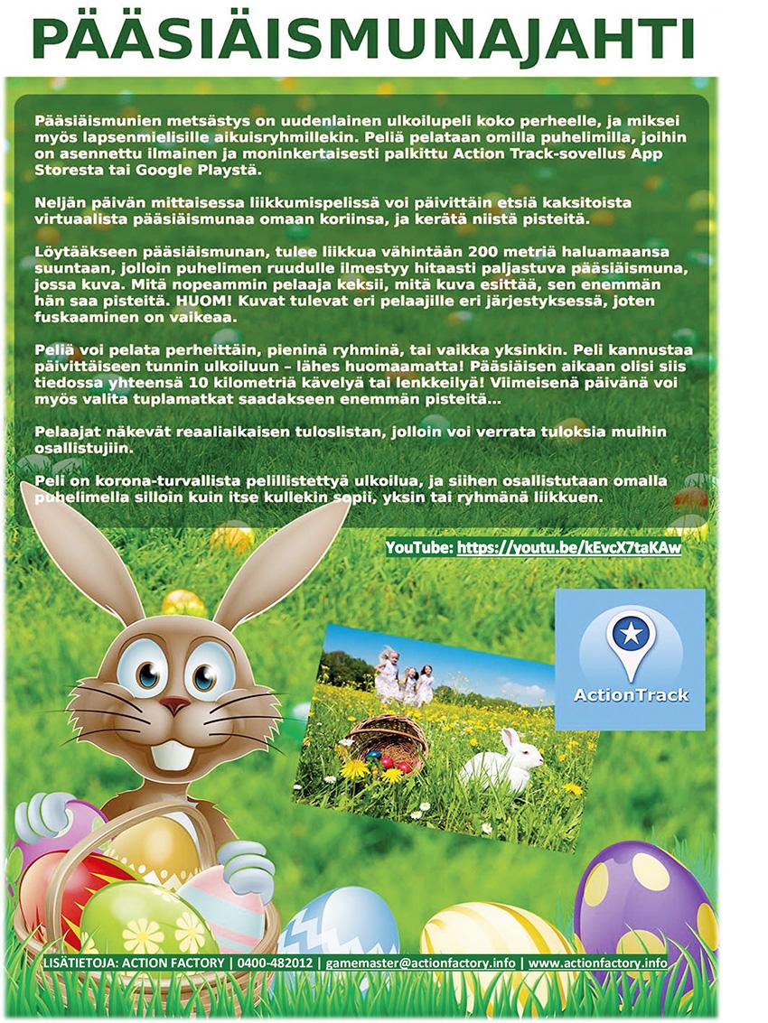 VINKKI: Perheille tarkoitettu pääsiäismunajahti on Action Factoryn virtuaalipeliuutuus. Neljänä pelipäivänä voi perhe lähteä ulkoilemaan ja etsiä omalla kännykkäsovelluksellaan 12 virtuaalista yllätysmunaa.