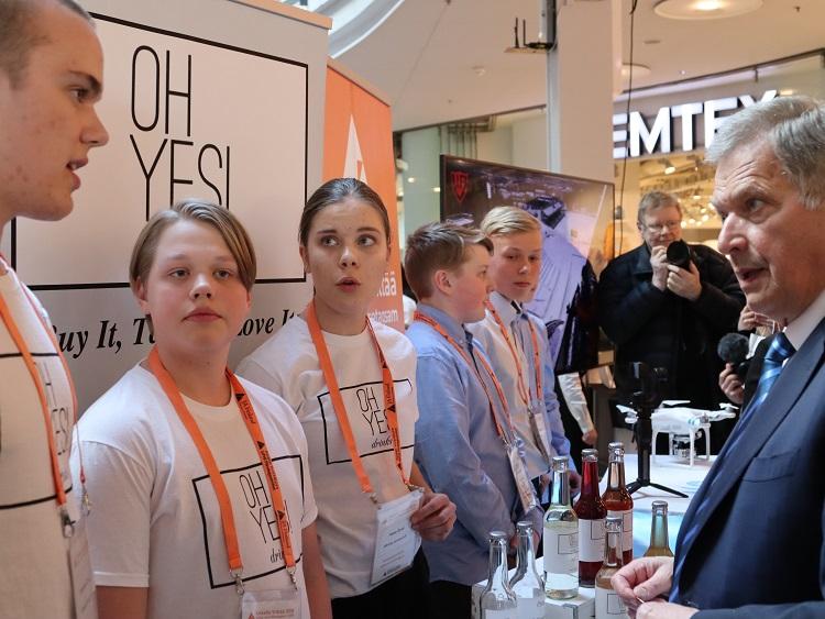 Presidentti Niinistö kävi juttelemassa lukuisten nuorten kanssa ja kannustamassa heitä. Jututettavina olivat muun muassa porvoolaisen Oh Yes Drinks -yrityksen nuoret, jotka valmistavat limsoja.
