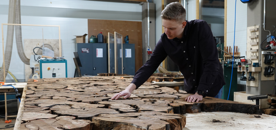 - Hän tuottaa pohjoiskarjaisesta puusta uniikkeja tuotteita ja sisustusratkaisuja, jotka on tunnettu niin valtakunnallisesti kuin myös kansainvälisesti. Tunnettuja töitä on mm. peliyhtiö Supercellin pääkonttorin saunatilat ja Ähtärin eläinpuiston pandapallot.