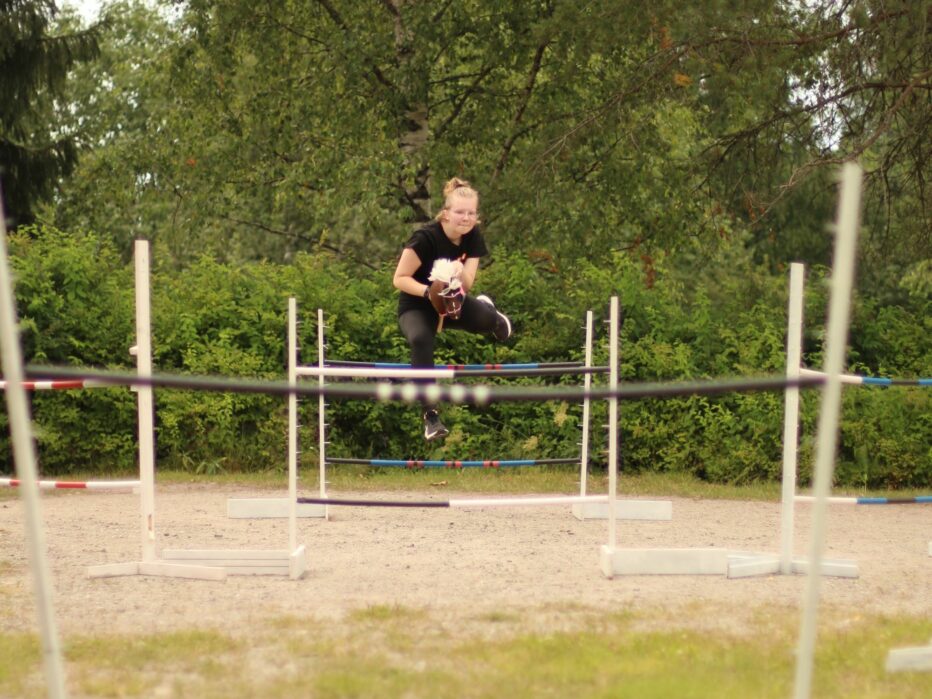Radalla on kymmenen estettä, joiden yli ratsastajat hyppäävät keppihevosen selässä.