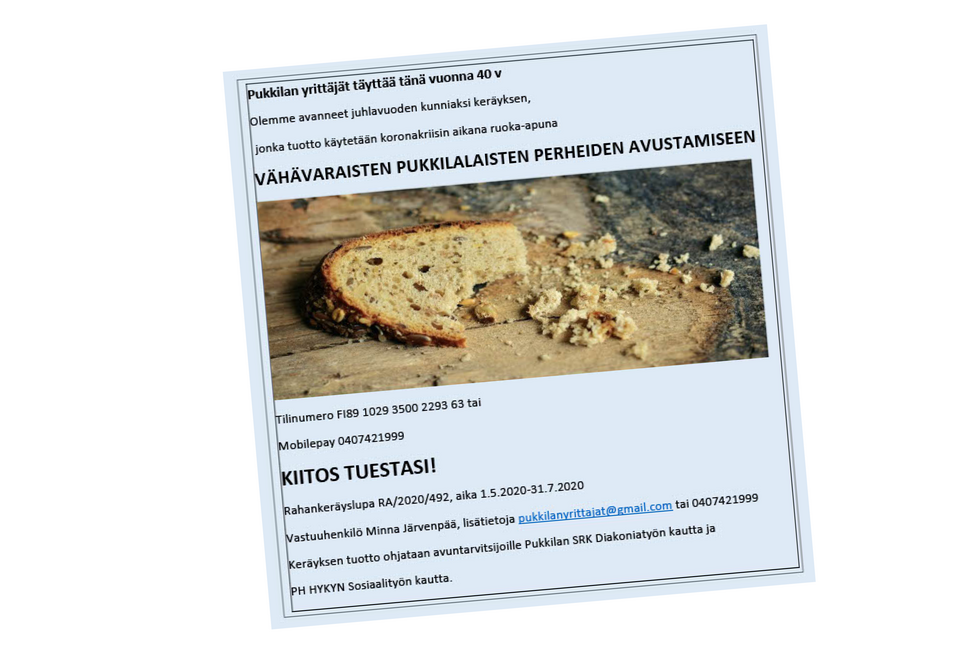Pukkilan yrittäjät järjesti 1.5.-31.7.2020 pienkeräyksen, jonka tuotto jaettiin ruoka-apuna Pukkilan kunnan vähävaraisille perheille. Rahaa saatiin kerättyä sen verran, että myös muutaman perheen koululaiset saivat kaipaamansa sähköisen oppimisalustan. Rahaa kerättiin lahjoituksina yhteensä 2681 euroa.