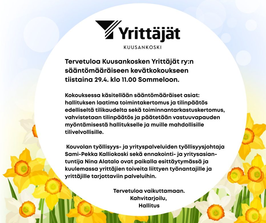 Tervetuloa Kuusankosken Yrittäjät ry:n sääntömääräiseen kevätkokoukseen tiistaina 29.4. klo 11.00 Sommeloon.