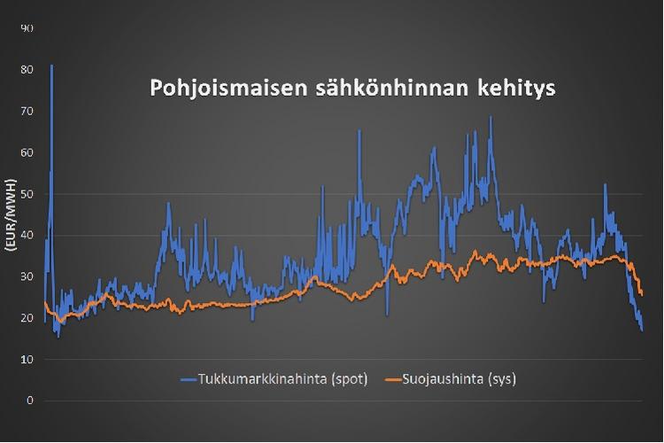 Viimeisten kuukausien aikana sähkön tukkumarkkinahinta (spot) on laskenut jyrkästi, mikä on aiheuttanut sähkön systeemihinnalle jopa 50 prosentin laskun. Samaan aikaan niin kutsuttu Suomen aluehintaero on noussut voimakkaasti, koska kaikkea halpaa sähköä ei pystytä siirtämään tänne. Kokonaisuutena hinnanlasku on kuitenkin poikkeuksellinen, joten tilanne kannattaa hyödyntää.