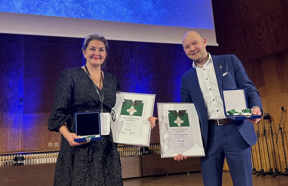 Petri Salmiselle ja Mari Laaksoselle ojennettiin perjantaina Yrittäjäristin suurristit.