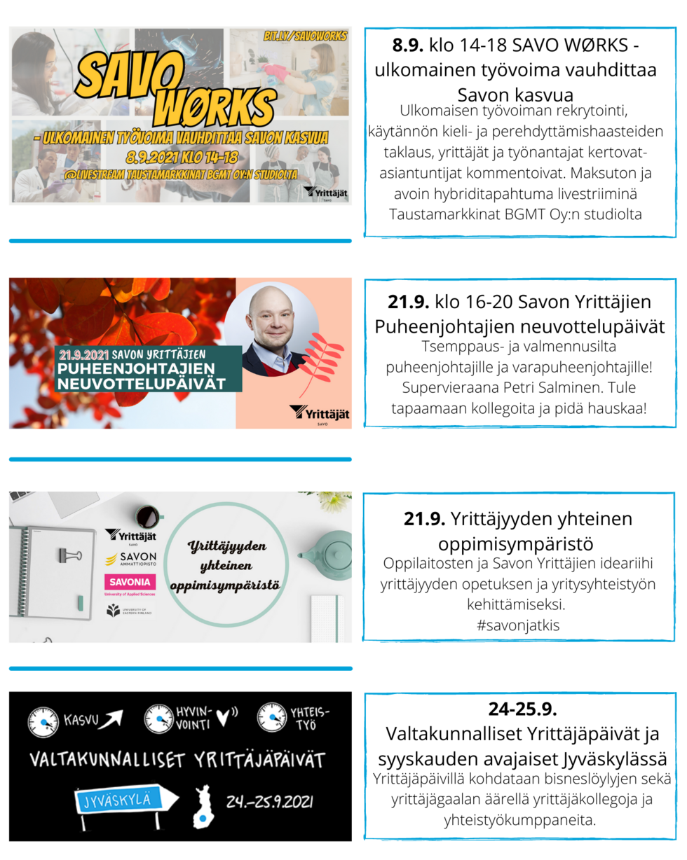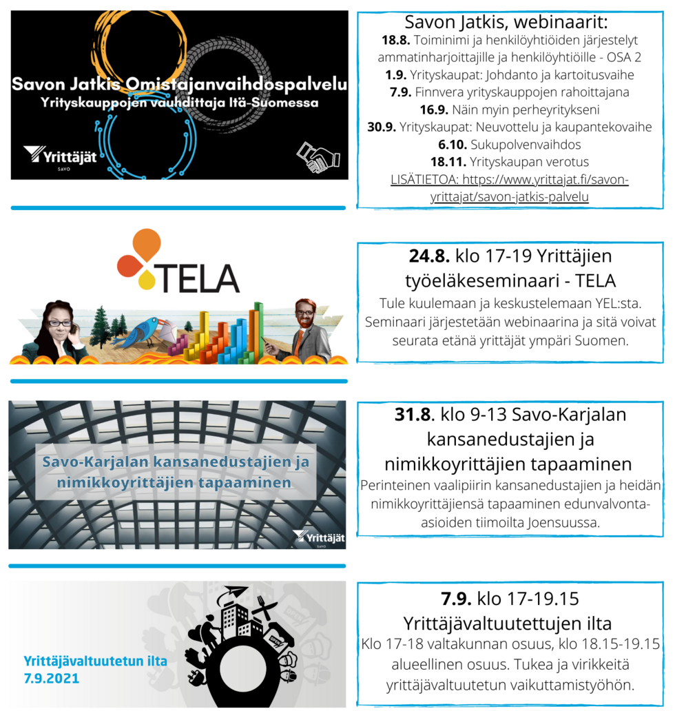 20.8.2021 klo 10:23 Uutinen Savon Yrittäjien syksy on täynnä tapahtumia Tämä teksti on konekäännetty. Jaa Kopioitu leikepöydälle