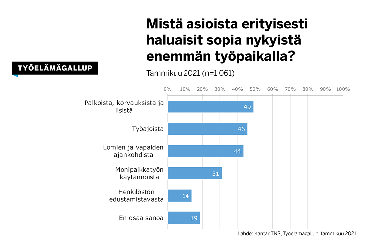 Työelämägallupin mukaan 49 prosenttia vastaajista haluaisi sopia työpaikoilla palkoista, korvauksista ja lisistä, 46 prosenttia työajoista, sekä 44 prosenttia lomien ja vapaiden ajankohdista enemmän kuin nyt. 31 prosenttia haluaisi sopia monipaikkatyön käytännöistä.