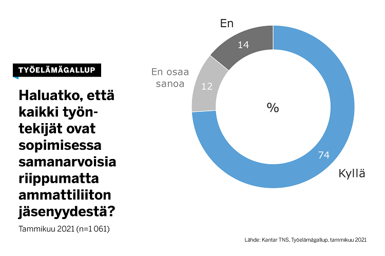 Työelämägallupin tuloksissa 74 prosenttia vastaajista kannattaa sitä, että kaikki työntekijät ovat sopimisessa samanarvoisessa asemassa riippumatta ammattiliiton jäsenyydestä. Eri mieltä on vain 14 prosenttia vastaajista, eniten yli 55-vuotiaiden ikäryhmässä.