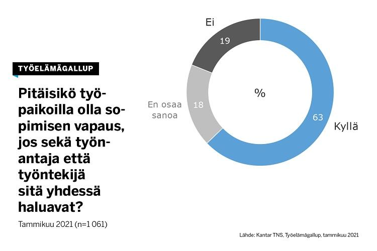 Työpaikoille pitäisi saada sopimisen vapaus. Näin voi päätellä Suomen Yrittäjien Kantar TNS:llä teettämän työelämägallupin tuloksista. Työllisistä 63 prosenttia haluaa, että työpaikilla voisi sopia työehdoista, jos sekä työnantaja että työntekijä sitä haluavat.