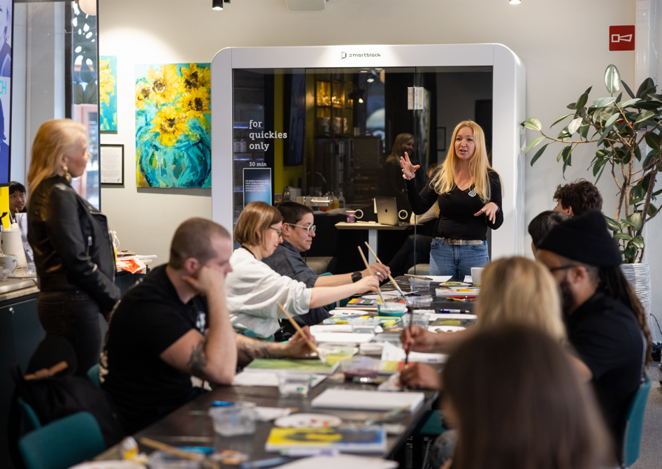 Sinako tarjoaa myös ainutlaatuista yhteisötaidetta, jossa jokainen osallistuja maalaa ajatuksensa ja tunteensa valitun teeman ympärille. Minna viimeistelee tämän yhteisen hetken ja jokaisen jättämän pensselinjäljen kiehtovaksi taideteokseksi, luoden tapahtumasta merkityksellisen tunnemuiston. Myös valmennuksista, esimerkiksi arvoista tai yrityksen visiosta, voi tilata yrityksen seinälle inspiroivaa ja motivoivaa taidetta.