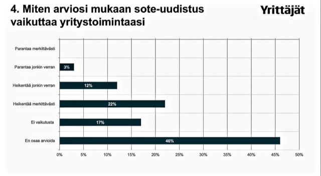Vastaajat kokevat valmistelussa olevan sote-uudistuksen pääosin heikentävän liiketoimintamahdollisuuksiaan: Niistä vastanneista, jotka arvioivat tietävänsä uudistuksen vaikutukset, peräti 62 prosenttia kertoo uudistuksen heikentävän yritystoimintaansa. Vain kahdeksan prosenttia arvioi uudistuksen parantavan yrityksen toimintamahdollisuuksia. 31 prosenttia kokee, että uudistuksella ei ole vaikutusta yrityksen toimintaan.